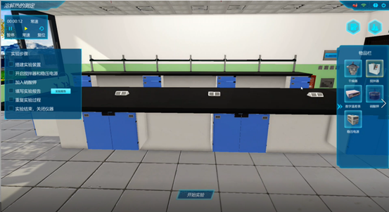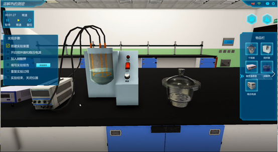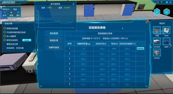 反应过程的调控:溶解热的测试,主要通过加入硝酸钾,调节稳压电源保持电流恒定输出,记录加热时间。此过程学生可随意设定初始温度,并随意加入硝酸钾的体积,在记录时间过程中可暂停实验,方便记录数据,提高实验成功率。