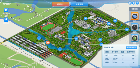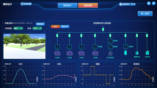 规划设计:学生可以校园的负荷情况跟微电网搭建的规则,在三维场景中,进行光伏、风机、储能的安装,形成微电网方案。 然后进行能量管理策略选择与制定、微电网运行状态观测与讨论。学生选择不同场景(光照强度、风速),制定微电网能量管理策略,通过对比不同场景下能量管理策略的异同,加深对微电网运行过程的认知。