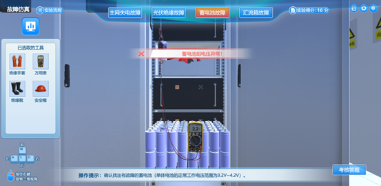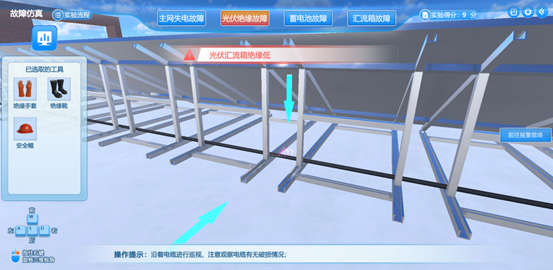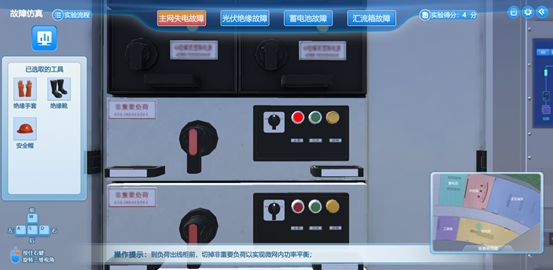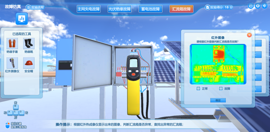 故障仿真:该内容涵盖了微电网主要发生的四种典型故障,具体包括主网失电故障、光伏绝缘故障、蓄电池故障、汇流箱故障。故障处理难以通过实际的微电网实验室实现,通过虚拟仿真软件,学生可以对在虚拟校园三维场景中模拟实际工程类操作,包括主网失电倒闸操作、绝缘异常检测方法、蓄电池故障排除、红外热像仪应用,进一步加深对微电网技术应用的理解。